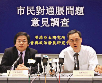此外,最多受訪者(30.4%)認為“內地物價上升”乃通脹主因,其次是“國際物價上升”(19.4%),認為是“特區政府打擊通脹不力”的只有12.1%,反映市民多認為通脹來自外來因素。不過,有85.1%受訪者認為應“增加長者生果金額”,其次是“限制水電燃氣加費”、“限制公共服務加費”。