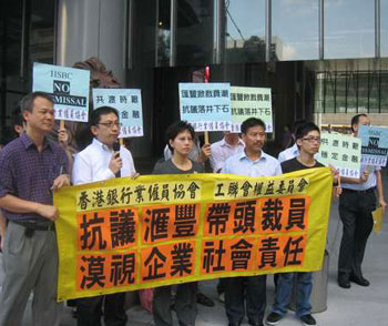 匯豐裁減人手,香港工會立即發起抗議。工聯會26日聯同香港銀行業雇員協會十名會員,到中環匯豐銀行總行抗議,不滿匯豐銀行“帶頭”裁員,不體恤員工的壓力和辛苦,其后匯豐銀行派人接收請愿信。