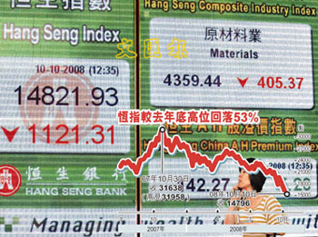 十月十日,香港恒生指數收市報一萬四千七百九十六點八七(14796.87),下挫一千一百四十六點三七(1146.37)。港股累計一周下跌二千八百八十六點,跌幅達一成六。 中新社發 鄧慶樂 攝