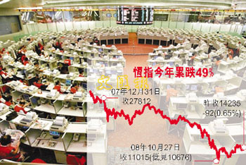 恒指30日收報14235點,今年以來計,跌幅達49%或13600點,以點數計是歷年最大,以百分比計是歷年第二大。受環球金融海嘯拖累,年內市況極為動蕩,連強積金也大虧,無論大戶散戶,也不論有否投資股票,人人損失慘重。