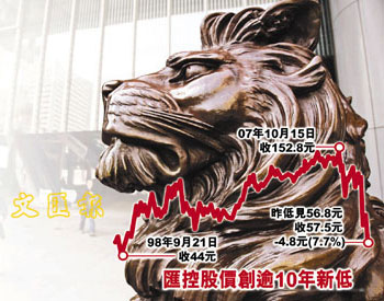 匯控20日在倫敦股市繼續(xù)下挫,中段股價(jià)跌逾4%至480便士,相等于51.94港元。于20日晚11時10分,匯控美國預(yù)托證券(ADR)折算每股報(bào)52.81港元,較香港收市再跌4.69港元,預(yù)示匯控21日仍會續(xù)跌。