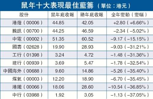 大市重挫,恒指成分股亦不見得好過。在42只藍(lán)籌股中,只得港燈(00006)一只錄得升幅,全年計(jì)漲2.8元或6.66%;緊隨其后已為跌5.02%的鼠年藍(lán)籌新貴騰訊(00700),其余成分股大部分跌幅逾五成以上,富士康(02038)更跌近八成。