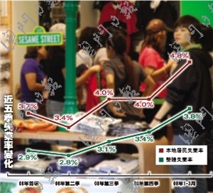 中新網5月5日電 《澳門日報》今日在頭條刊發報道稱,金融海嘯對澳門就業市場的沖擊漸顯。統計局數據顯示,最新一期就業調查(今年1至3月)的失業率較上期(2008年12月至今年2月)上升0.2%,達3.8%,重上2006年中水平,就業不足率上升0.1%,達至1.8%。