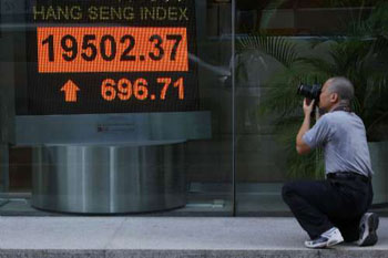 香港股市20日跟據外圍高開200點,輕易升破19000點關口拾級而上,中午收市升447點,在深滬股市推波助瀾之下,港股午市升勢持續擴大,最多升700點,金融股及地產股齊齊為股市添動力,指數以接近全日高位收市,報19502點,上升696點或3.7%,多只藍籌股重返去年由雷曼爆煲引發的金融海嘯前水平,國企指數升幅超過4%或446點,收市報11593點。