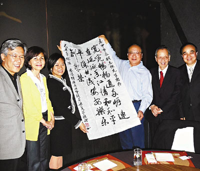 會上,梁美芬送了一幅字畫給胡志強作見面禮,上面寫有她創作的一首賦:“寬寬暢暢通海峽、連連延延香江情、和和平平謀共識、安安樂樂創繁榮”。胡志強也禮尚往來,充分發揮其幽默本色,說“從政就是要所有人快樂”。