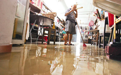 商店林立的永安街的商鋪無(wú)一幸免,一間海味商店被倒灌海水“攻陷”,后門(mén)涌水前門(mén)出,有士多店老板因人手不足,海水急湍淹至店內(nèi),貨品和電器被浸壞須報(bào)銷(xiāo),粗略估計(jì)損失2至3萬(wàn)元;另有海味店?yáng)|主表示得悉臺(tái)風(fēng)襲港已提早一天做好防水準(zhǔn)備,將貨物擺放至更高的位置,但店內(nèi)仍然有不少貨物被浸爛,料損失大約1萬(wàn)元的貨品。