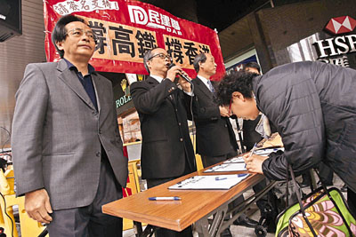 自由黨14日中午12時開始,也在中環發起“80后撐高鐵、反拉布”活動,呼吁市民簽名“撐高鐵”,短短2小時收集近2000個簽名,并交給立法會財委會主席劉慧卿,同時將一封請愿信交給行政長官曾蔭權。