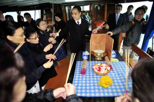 港府近年推廣骨灰海葬,惟租用私營船只費用高昂,需花費二千至四千元,食環(huán)署特別推出免費渡輪服務,估計每年可處理近五百宗申請,每年支出約十八萬元。渡船服務自上月三十一日起接受申請,截至昨日共收到二十三宗申請,反應不錯。其中六個家庭率先于昨日啟航。他們小心翼翼地捧著六個骨灰甕,渡船由西灣河公眾碼頭出發(fā),前往東龍洲以東海域,準備為這些往生者“集體海葬”。