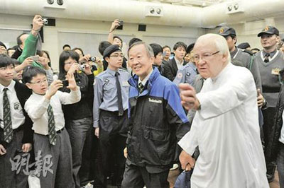 身穿藍色外套、系上母校領帶的高錕,7日出席母校圣若瑟書院成立135周年開放日開幕典禮。精神飽滿的高錕在全場熱烈掌聲下,由校監湯瑪士修士陪同進入禮堂,太太黃美蕓則拉著高錕的外套,緊隨其后進場。