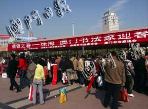 3日下午在口岸廣場(chǎng)和暖的陽光下,兩地書法家們對(duì)著一條拼成近20米長(zhǎng)的長(zhǎng)桌大筆潑墨,一幅幅飽蘸金粉的春聯(lián)將春節(jié)漸近的氣氛襯托得無比濃烈。為方便旅客,每個(gè)書法家面前都備有一份包括數(shù)百幅春聯(lián)的數(shù)據(jù),索要者選中任何一幅,書法家立即現(xiàn)場(chǎng)揮毫題寫,使索要者立即可取。