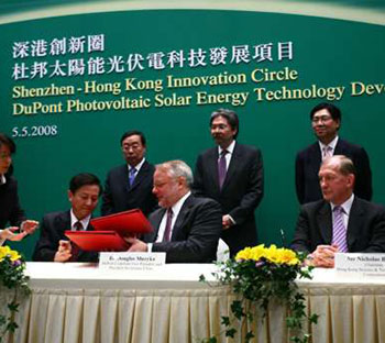 同時,深圳市政府會與香港合作,提供土地及其它設備支持太陽能科技的下游發展項目及產品制造,杜邦將會在深圳光明新區,投資建設太陽能源的生產基地。