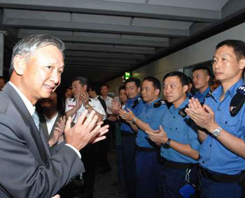 中新網5月23日電 據香港大公報報道,參與四川大地震搜救工作的香港搜救隊成員,22日晚自成都返港,獲得英雄式的歡迎。香港保安局局長李少光在歡迎式上致詞,盛贊各人表現英勇和專業,不畏艱辛的無私奉獻,令港人感到驕傲。儀式完成后,隊員上前輕吻妻兒,更有人不禁流下男兒淚。