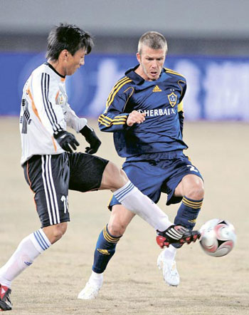 這次洛杉磯銀河“亞洲之旅”共分韓國(guó)首爾、中國(guó)上海及香港3站,貝克漢姆5日于上海八萬人體育場(chǎng)帶領(lǐng)銀河以3﹕0擊敗東亞晨曦聯(lián)隊(duì)。貝克漢姆正選上陣,披甲70分鐘,并貢獻(xiàn)了1次助攻。