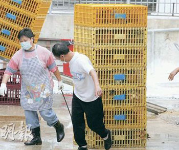 香港自元朗雞場爆發禽流感后禁售活雞21天,30日解禁,長沙灣批發市場工人29日趕忙將抵港內地活雞送往安置。(圖片來源:明報)