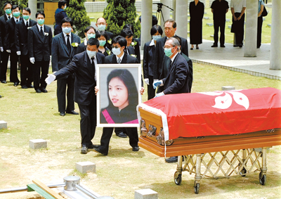 謝婉雯醫(yī)生逝世,下葬浩園(香港安葬因公殉職公務(wù)員之地)。(馬泉崇蘋果日?qǐng)?bào))因感染SARS而逝世的35歲女醫(yī)生謝婉雯身后被傳媒冠以“香港女兒”的稱號(hào)。謝婉雯的父親曾寫下一段話送予港人:“希望婉雯的勇氣和犧牲精神,能夠鼓勵(lì)港人永不放棄。”