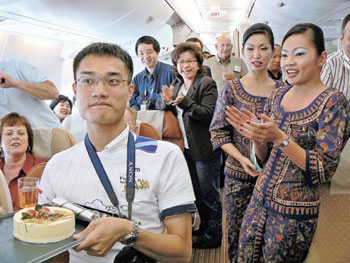 根據新加坡航空資料,約有10多名港人成為A380首航的見證人,當中包括獨自登上航機的年輕人Francis Wu。昨日度過22歲生辰的Francis,正忙于以手提電腦輸入日志時,機組人員神秘地捧蛋糕走近,為他慶祝。其它乘客亦加入慶祝行列,一同拍掌唱生日歌,空姐亦特別送上生日卡,難怪Francis說:“今次是他人生中最好的一個生日。”在美國舊金山City College修讀計算機科技的Francis表示,數月前父母問他今年希望收到什么生日禮物時,他說希望可乘坐A380的首航,于是父母以1250美元(約9750港元)為他投得機票。