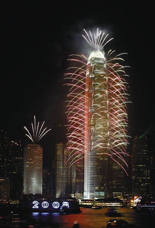 二十三時五十九分,行政長官曾蔭權在尖沙嘴文化中心啟動倒計時儀式。二00七年的最后二十秒,國金二期北面外墻兩側由三十二層起依次向上燃放焰火,火樹銀花照耀整個維港;合和中心、AIG大廈、長江集團中心及東企業廣場四棟大廈,外墻同時顯示倒計時時間,停泊在維港的滅火輪則向海面噴射多樣的水花……