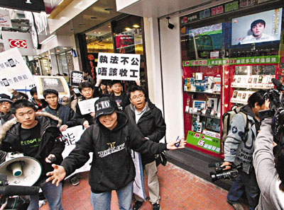 網(wǎng)民沿途高叫口號及展示標(biāo)語,游行人士途經(jīng)一間店鋪時,店外電視正在播出早前陳冠希的道歉錄像,隨即惹來網(wǎng)民起哄,大呼“選擇性執(zhí)法可恥”等口號。