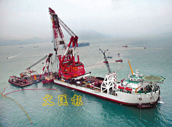 資料圖:由中國交通部廣州打撈局派出的大型打撈船“華天龍”,在香港水域小磨刀東面,成功將沉沒的烏克蘭補給船的煙囪及駕駛艙部份吊出水面。 中新社發 鄧慶樂 攝