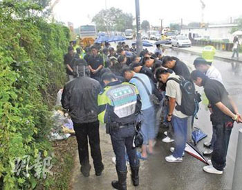 蘇志豪的親友11日到殮房認尸后,與其同事分乘兩架旅游大巴,一行逾百人到出事現場致祭。部分女親友表現激動,不斷流淚,要由旁人攙扶安慰,場面哀傷。
