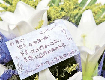 一群曾經由殉職消防隊員蕭永方訓練的消防學員,獻上鮮花及寫有“逝去但傲氣不滅”等字句的心意卡,向蕭永方致敬及表示懷念。(圖片來源:明報)