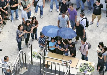 殉職消防員陳兆龍的母親(傘下合十者)到嘉禾大廈天臺拜祭愛兒。另一殉職消防隊員蕭永方的妻子,則由親友攙扶,等候向丈夫致祭。(圖片來源:明報)