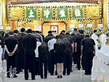 舍命救人的陳兆龍去世近一個月,陳家4日在世界殯儀館為兆龍設靈。靈堂以清雅的白色及香檳色為主,綠色的橫匾寫著“往生凈土”4個大字,兩邊掛著一對挽聯:“取義忘生男兒蕩盡英雄氣,精忠報港百姓同哀烈士魂”。