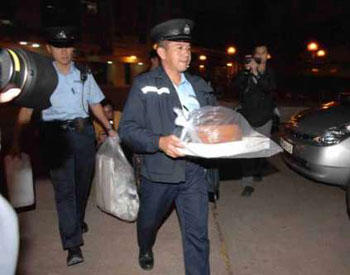 警員檢走一個湯煲,疑有人下藥迷昏子女再施毒手。(圖片來源:大公報)