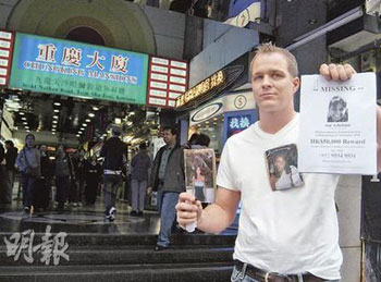 加拿大籍女子Ani Ashekian失蹤后,其男友Wenddell Walsh來香港尋人,他身上掛有女友照片,不斷派發傳單呼吁知情者提供消息。(圖片來源:明報)