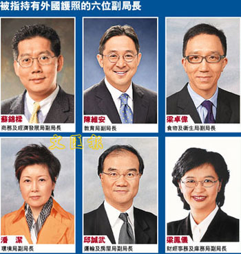 有傳媒28日引述“接近政府消息人士”稱,除候任商務(wù)及經(jīng)濟發(fā)展局副局長蘇錦梁被指持有加拿大護照外,另有5名候任副局長也被懷疑持有外國的居留權(quán),包括候任教育局副局長陳維安、食物及衛(wèi)生局副局長梁卓偉、環(huán)境局副局長潘潔、運輸及房屋局副局長邱誠武、財經(jīng)事務(wù)及庫務(wù)局副局長梁鳳儀等,使事件更令人關(guān)注。