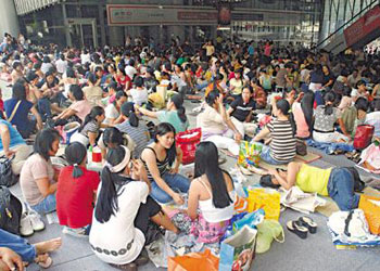 資料圖:每當周末﹐菲傭們便三五人、幾十人集中在一起﹐聚餐、聊天﹐享受她們自己的生活。 中新社發 王麗南 攝