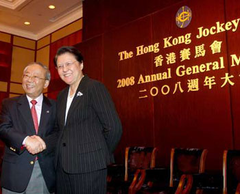 馬會(huì)4日舉行會(huì)員周年大會(huì),遴選會(huì)員選出一名新任董事,另外5位董事獲選連任。現(xiàn)任董事郭勤功今年10月將屆70歲,因此決定退任。大會(huì)后,范徐麗泰獲選填補(bǔ)因郭勤功退休而騰出的空缺,任期2年。同時(shí),陳祖澤和施文信分別獲連任馬會(huì)2008至2009年度主席及副主席之職。