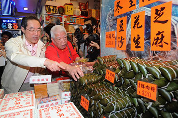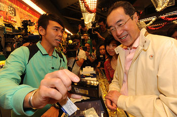 唐英年與多名官員及立法會議員到銅鑼灣的商店及餐館消費,鼓勵市民積極參與“促消費、保就業”行動。(圖片來源:香港特區政府網站)