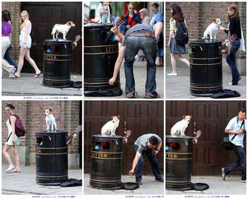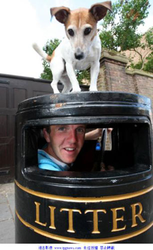 中新網7月8日電 據臺灣“今日新聞網”7日報道,英國一位知名的街頭藝人查理卡維(Charlie Cavey)總是躲在垃圾桶里自彈自唱。但這種表演方式行動不便,賞金時常被偷走或搶走,于是最近找來一只杰克羅素犬“歐比”(Obi)幫他把風。歐比乖巧的模樣,令人聯想到在唱片上有超過100年歷史的知名LOGO。