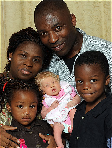 中新網7月20日電 據英國媒體報道,近日在英國倫敦東部的伍爾維奇,一對尼日利亞黑人夫婦喜得他們的第三個孩子。讓所有人意外的是,這個新生女嬰居然是典型的白種人,長著漂亮的藍眼睛和卷發。