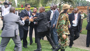 烏干達總統旅發言人艾基森魏思加(音譯)表示:“兩次沖突都是因利比亞方面缺乏尊重導致的。”記者納塔爾透露,卡扎菲非常生氣,甚至掌摑了他的衛隊成員。