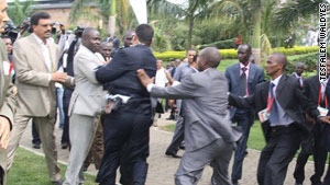 峰會第一天,利比亞總統衛隊即與烏干達安全人員發生了拳腳沖突。根據CNN記者薩曼森納塔爾的描述,當時正要舉行峰會開幕式。按照規定,只有國家首腦被允許進入會場。利比亞總統衛隊試圖護送卡扎菲通過入口,遂與烏干達安全人員發生爭論,隨后升級為肢體沖突,但是雙方沒有動槍。