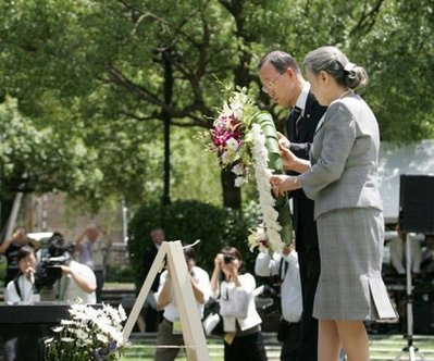 潘基文還前往爆炸中心地公園,向“原子彈落下中心地碑”獻花,然后向全世界宣布自己決心作為聯合國秘書長全力創建“無核武世界”。此外,潘基文還向附近的“長崎核爆朝鮮死難者追悼碑”獻了花。