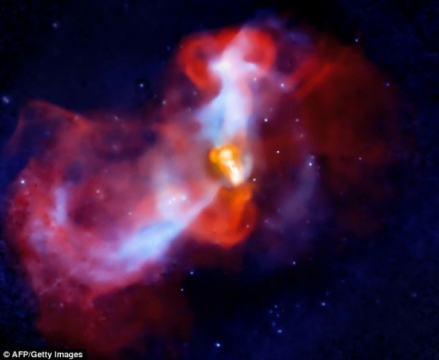 M87星系充滿炙熱氣體并發(fā)出X射線(藍(lán)色),可以被錢德拉望遠(yuǎn)鏡探測(cè)到。隨著溫度不斷降低,氣體向星系中部移動(dòng)。在中部,它們的溫度以更快速度繼續(xù)冷卻,形成新的恒星。甚大望遠(yuǎn)鏡陣列進(jìn)行的射電觀測(cè)結(jié)果顯示,M87噴流(紅色-橙色)中含有黑洞產(chǎn)生的高能粒子,干擾了這一過程。