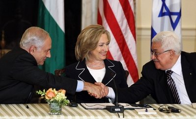 在美國國務卿希拉里的主持下,巴勒斯坦領導人阿巴斯和以色列總理內塔尼亞胡自2008年年底后第一次坐在同一張談判桌前,著手就以色列定居點、耶路撒冷歸屬等最終地位問題展開直接談判,以結束雙方數十年的沖突并實現“兩國方案”。