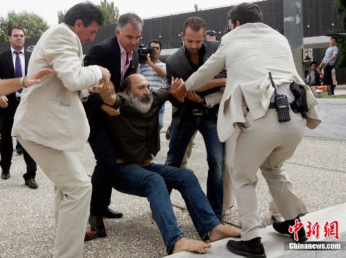 中新網9月12日電 據臺灣“中廣新聞網”11日報道,一名希臘男子因不滿希臘政府的經濟緊縮政策,對希臘總理帕潘德里歐丟擲鞋子。