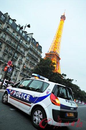 9月28日,巴黎艾菲爾鐵塔再受“詐”彈威脅,警車在附近戒備。