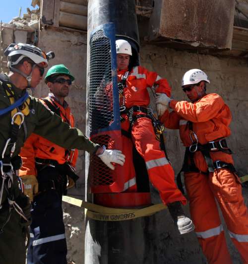 搭載受困礦工升井的是海軍特制救生艙“鳳凰號(hào)”,意欲礦工在脫困后“重生”。救生艙僅及肩寬,兩端分別裝有8個(gè)導(dǎo)向減震輪。艙內(nèi)將安裝一架攝影機(jī),鏡頭將聚焦礦工臉部及氧氣罩與雙向溝通器,設(shè)計(jì)升降速度為每秒1米。如果在升回地面期間出現(xiàn)險(xiǎn)情,礦工可以脫離救生艙,借助滑輪慢慢返回地底。