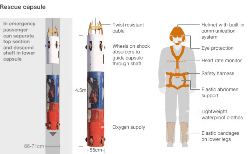 在救援艙內,礦工們將會穿上特制、重量超輕的防水服。他們還將戴上心律監測儀以便地面人員可隨時監控礦工在升井過程中任何細微的身體變化。