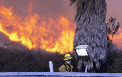 加州森林局發言人羅克珊·普羅瓦茲尼克透露,消防員正夜以繼日的進行滅火工作,1人在圣地亞哥附近參與救火的時候遇難,傷者中包括4名消防隊員。在圣地亞哥北部地區,大火燒毀了將近22.3平方公里土地,并正在威脅威奇河附近的民宅。