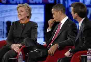 中新網(wǎng)1月22日電 綜合報道,美國民主黨總統(tǒng)候選人奧巴馬和希拉里-克林頓近日不斷在公開場合互相指責。1月22日,兩人又在南卡羅來納州就伊拉克及政府開支問題展開激烈爭論,而約翰-愛德華茲則指責他們的辯論是“爭吵”。