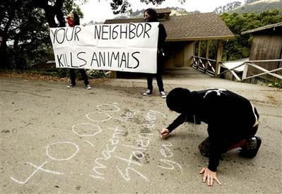 這9名抗議者,不顧天氣的炎熱,戴面具、裹頭巾,聚集在一名加利福尼亞大學伯克利校區的毒物學教授家門口,其中一名抗議者用粉筆在地上涂寫“殺手”的字樣,另一名抗議者用擴音器高呼:“你的鄰居殺害動物”。