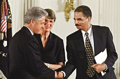 資料圖:霍爾德(右)曾在克林頓(左)政府時期,擔任司法部副部長。