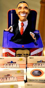 自當選總統的那一刻起,奧巴馬就成了商家的“搖錢樹”。隨著支持他的呼聲越來越高,各種以他為原型的商品層出不窮。T恤、籃球、棒球帽、戒指、鑰匙扣、筆、杯子應有盡有。在大街小巷,隨處可以看到和奧巴馬有關的小物品,諸如香煙、拳擊短褲、熱狗、高爾夫球、唇膏、腕表等,各色各樣,琳瑯滿目。