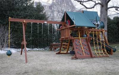 這套木制滑梯、秋千及攀爬套裝,是由美國紅木及香柏木所制,由南達科他州一間公司制造,符合奧巴馬推動的環保政策原則。暫時未悉這個迷你游樂場花了多少錢建造。